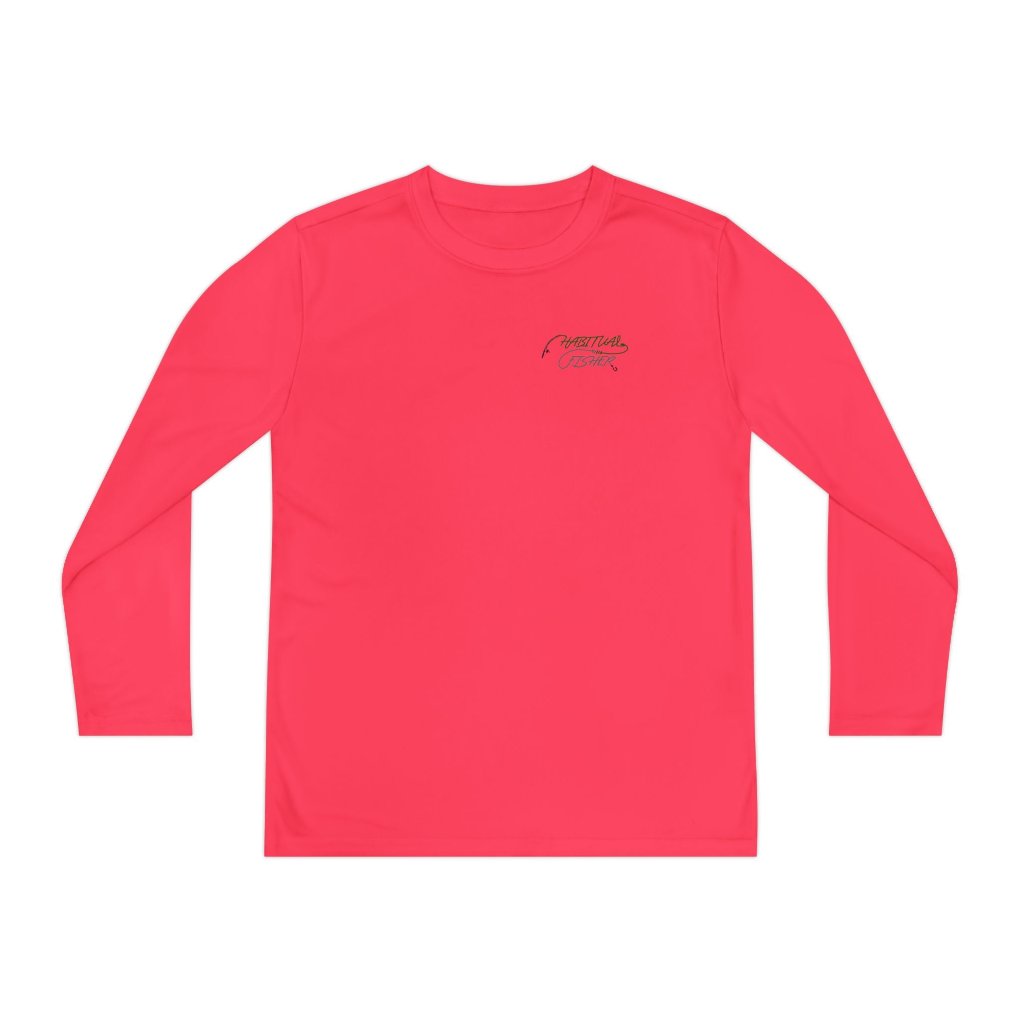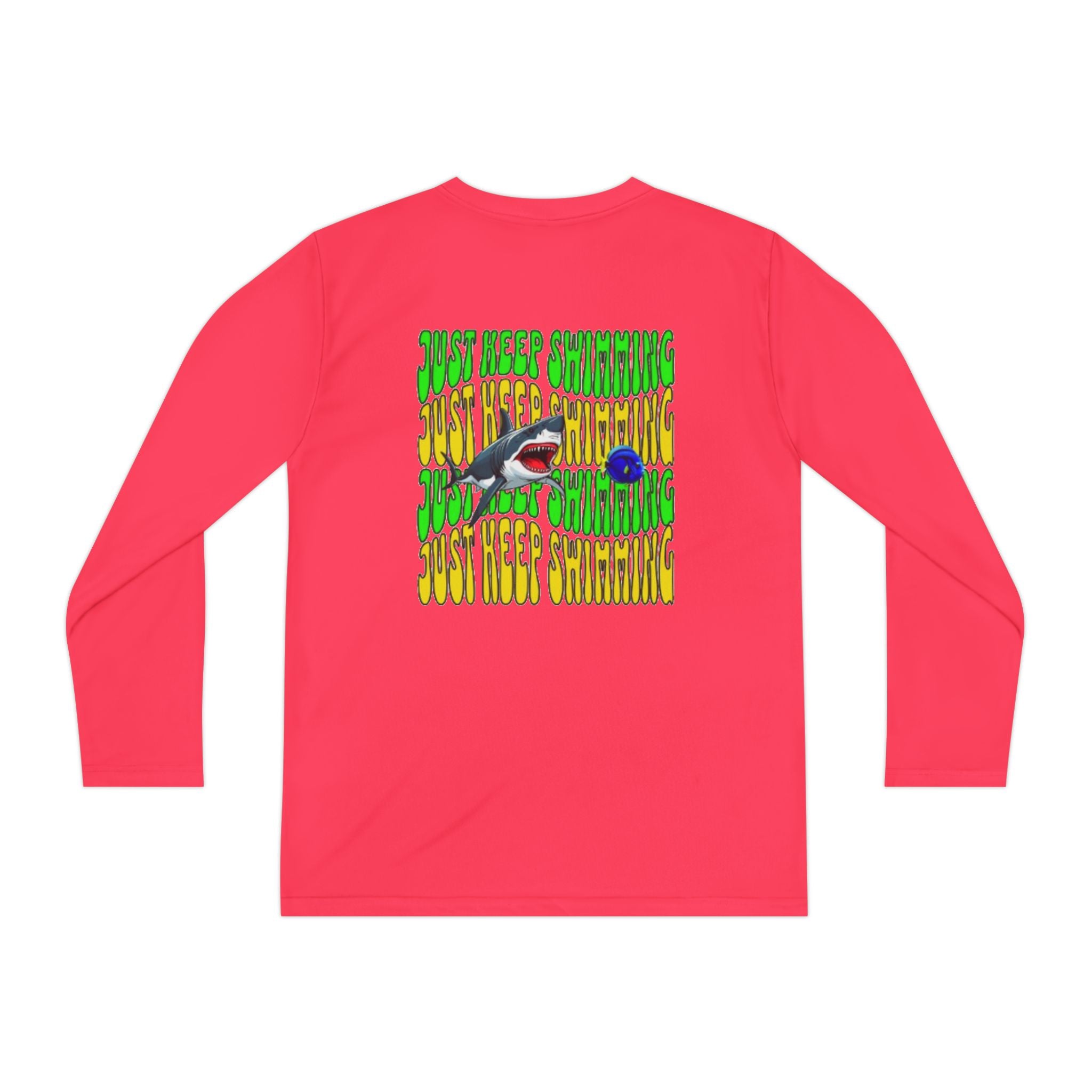 Lightweight, athletic long sleeve built for active kids who move all day. This breathable tee dries fast, and keeps its fit through practices, warm-ups, and sunny afternoons. A small chest logo keeps things simple on the front, while the back explodes with playful, colorful artwork — layered retro text and a cheeky shark add attitude without weighing things down. Wear it for fishing, training, beach days, or neighborhood games; it slides under jerseys, layers easily, and holds up to washes and sweat so the design stays bold and bright.