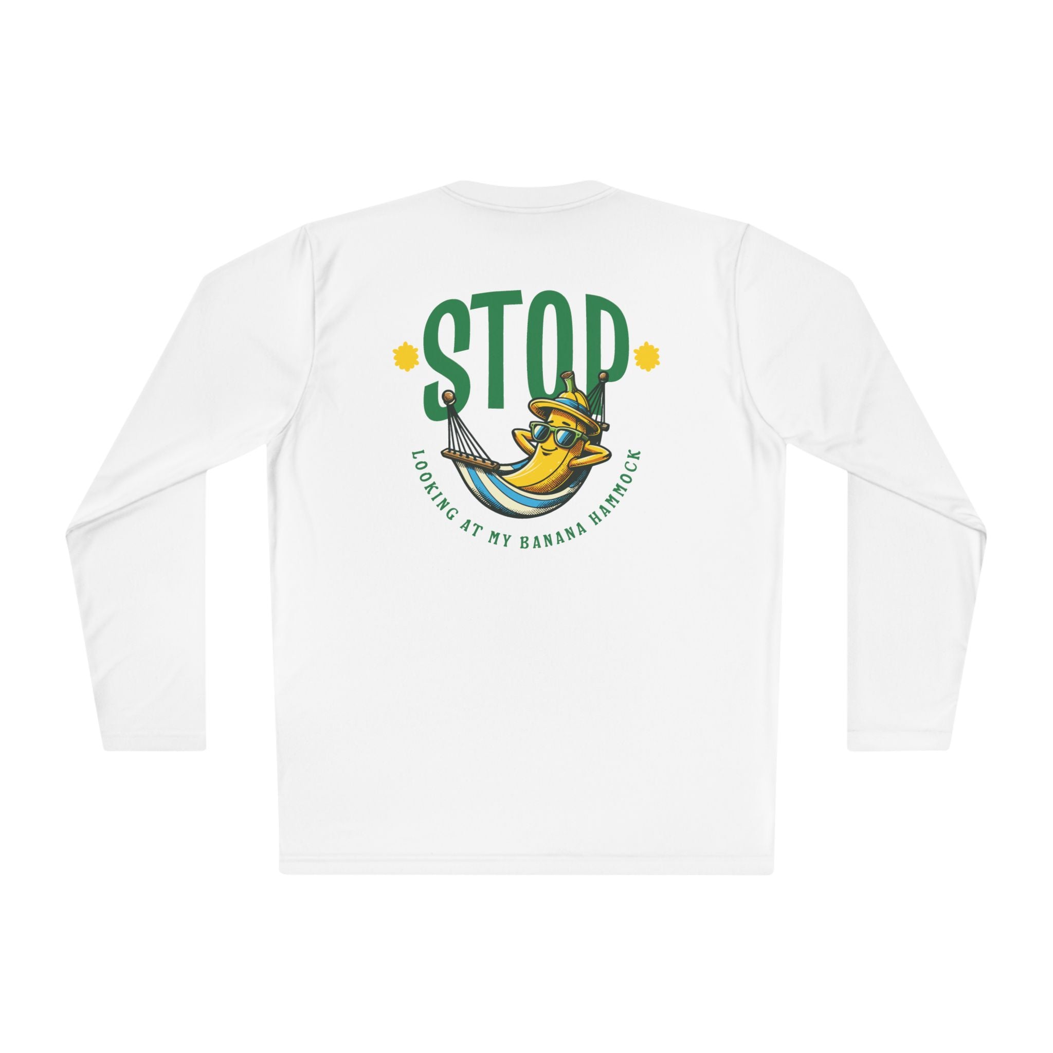 Lightweight long sleeve designed for active days under sun or sea breeze. The soft, extra-light polyester moves with you and pulls sweat away so you stay dry during hikes, fishing, paddle sessions, or backyard barbecues. A playful graphic on the back—bold lettering with a cheeky banana character—gives the shirt a laid-back, sporty vibe while a small chest mark keeps the front clean and simple. Wear it as your go-to layer for weekend outings, or casual afternoons when you want comfort without the bulk.